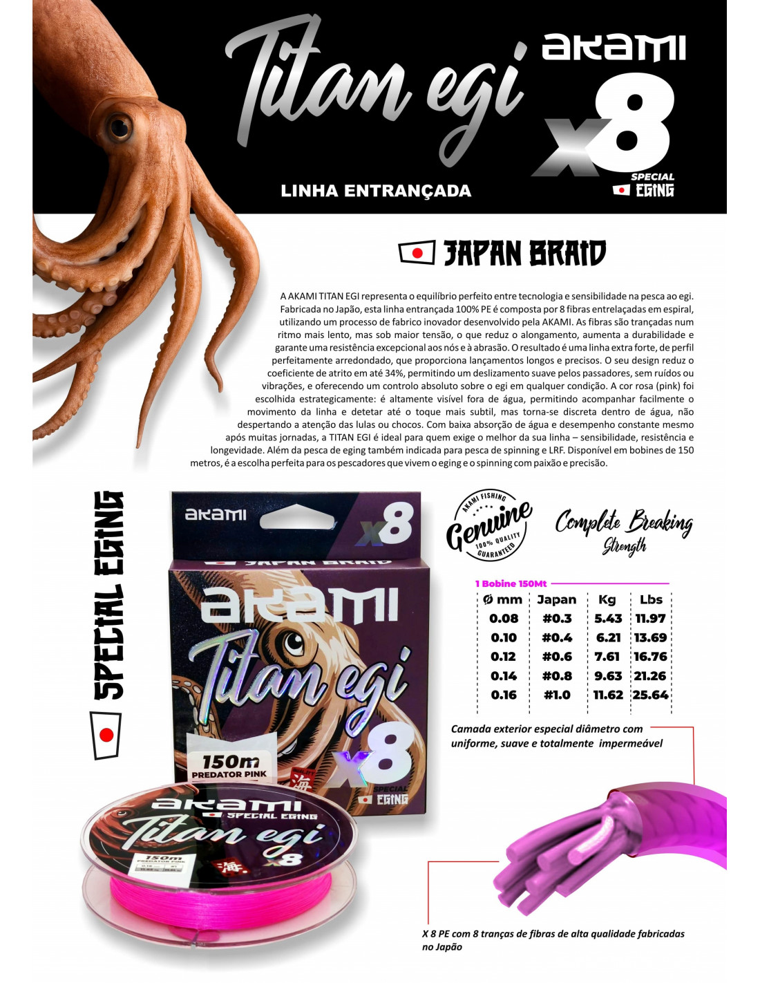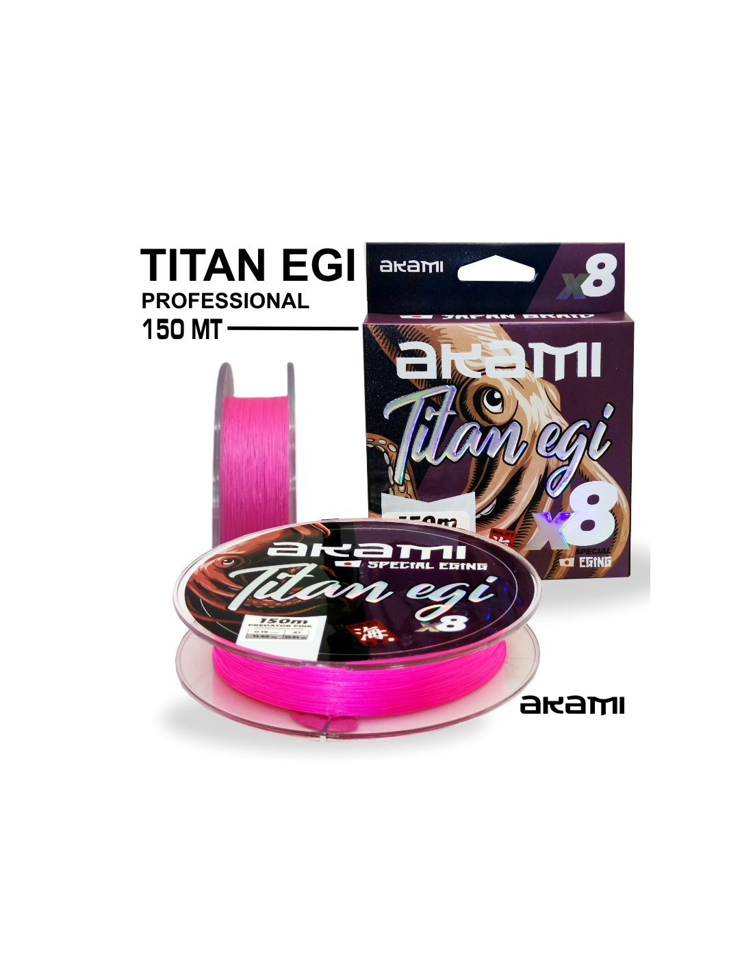 AKAMI TITAN EGI Braided Line – 8 Strands 100% PE (Pink) Product Description The AKAMI TITAN EGI is a high-performance Japanese braided line, specially developed for egi fishing — ideal for squid and cuttlefish. Made from 100% PE with 8 spirally braided fibers, this line uses an innovative AKAMI manufacturing process that braids the fibers at a slower pace, but with greater tension, increasing strength and durability while minimizing elongation. The result is an extra-strong line with high knot and abrasion resistance, low water absorption, and a perfectly rounded profile, ensuring long and smooth casts without vibrations or noise when passing through the guides.