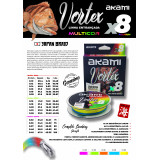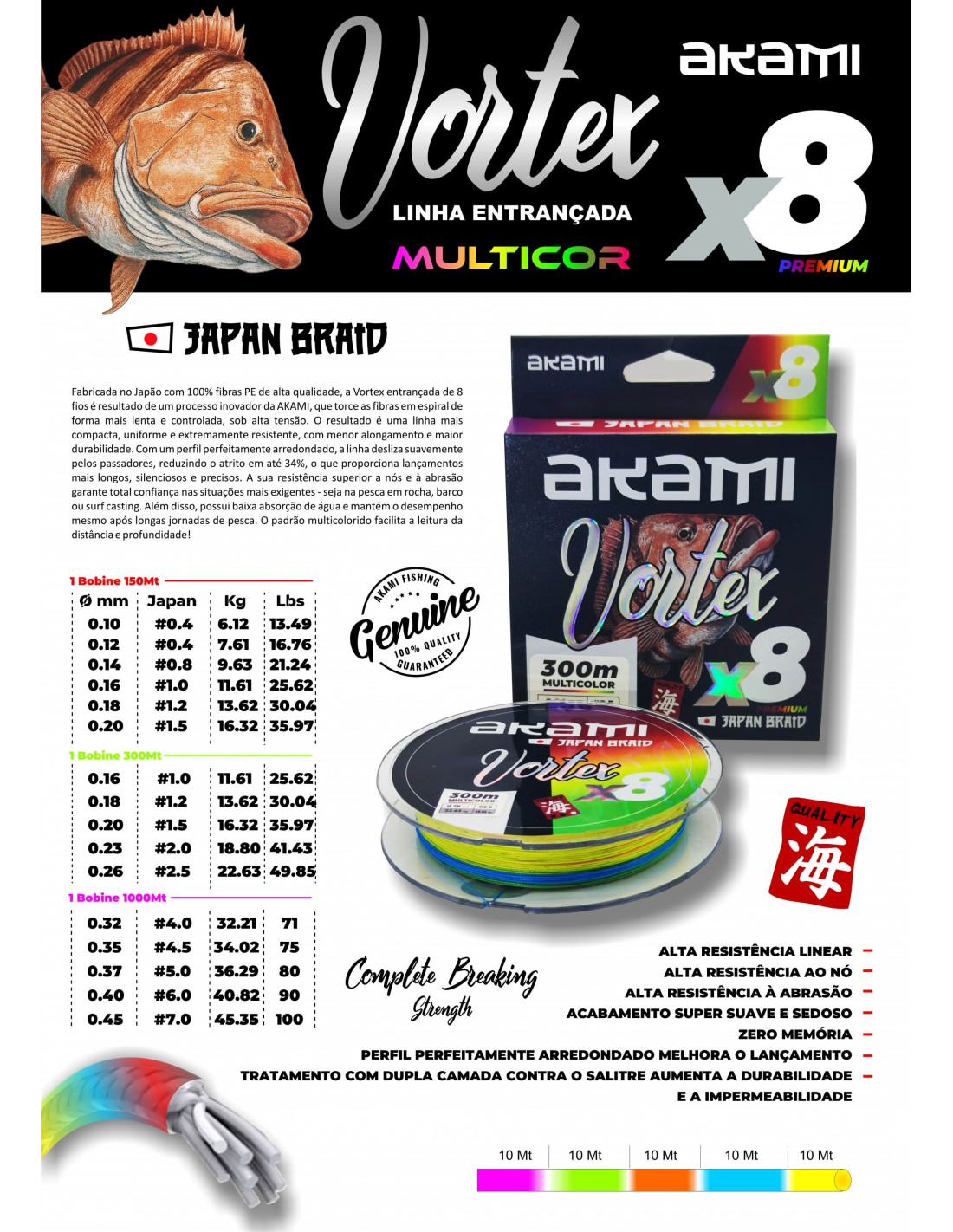 | Description Made in Japan with 100% high-quality PE fibers, this 8-strand braided line is the result of an innovative AKAMI process that twists the fibers into a spiral more slowly and in a controlled manner under high tension. The result is a more compact, uniform, and extremely strong line with less elongation and greater durability. With a perfectly rounded profile, the line glides smoothly through the guides, reducing friction by up to 34%, resulting in longer, quieter, and more precise casts. Its superior knot and abrasion resistance ensures complete confidence in the most demanding situations—whether fishing from rocks, boats, or surfcasting. In addition, it has low water absorption and maintains performance even after long fishing trips. The multicolored pattern facilitates reading distance and depth. 300-meter spool Maximum strength with unparalleled Japanese smoothness