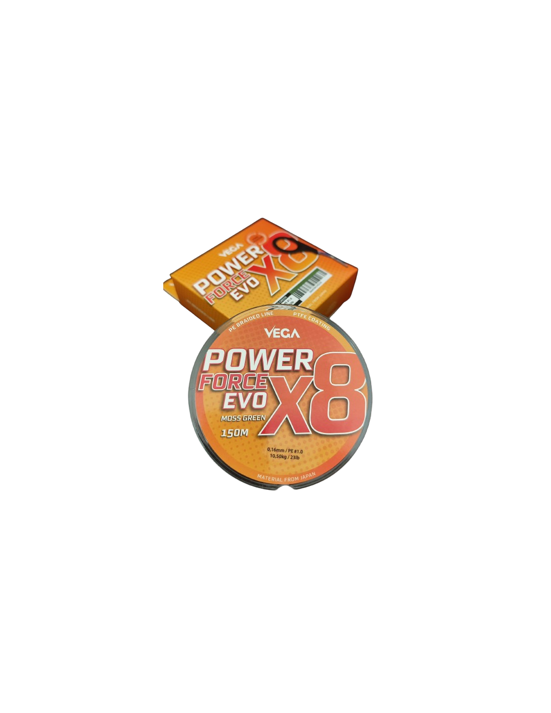 Description Vega Power Force Evo X8 Multifilament Line 150 Meters Moss Green Elevate your performance with the Vega Power Force Evo X8, the technological evolution of one of the most reliable multifilament lines on the market. Developed for demanding anglers, this Super Braid X8 combines precision engineering with high breaking strength and extreme smoothness. Ideal for Spinning, Jigging and Bottom fishing, it offers maximum sensitivity and excellent performance on long casts. This line comes with a free pair of scissors. Cutting-Edge Technology for Long Casts Made with 8 high-quality polyethylene (PE) fibers, the Power Force Evo X8 features a perfectly round profile and ultra-smooth surface.