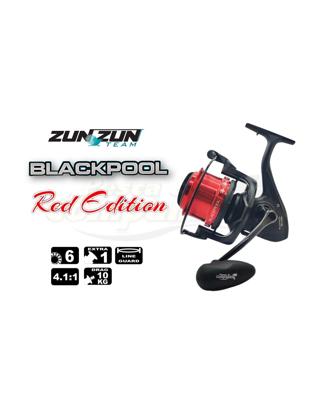 Description We present the BLACKPOOL reel from ZUN ZUN, a true reference among fishermen due to its mechanical reliability achieved thanks to its bronze and stainless steel construction. This reel is available in two colors: Blue Edition and Red Edition. It is made of ultra-light, high-density graphite, with an infinite anti-reverse system, thus guaranteeing smooth and flawless performance. The multi-disc clutch offers an impressive 10kg of power, making it ideal for facing the greatest challenges at sea. In the Blue and Red versions, the aluminum spool, designed for large casts, is cold forged and corrosion resistant, guaranteeing durability in any conditions. In addition, it comes with an extra graphite spool, providing greater versatility. The aluminum crank is designed to offer maximum strength, while the ergonomic handle ensures comfortable and efficient handling. The BLACKPOOL reel stands out not only for its build quality and performance, but also for its excellent value for money, making it an irresistible choice for surf casting and boat fishing enthusiasts. Discover the excellence and robustness of the ZUN ZUN BLACKPOOL!