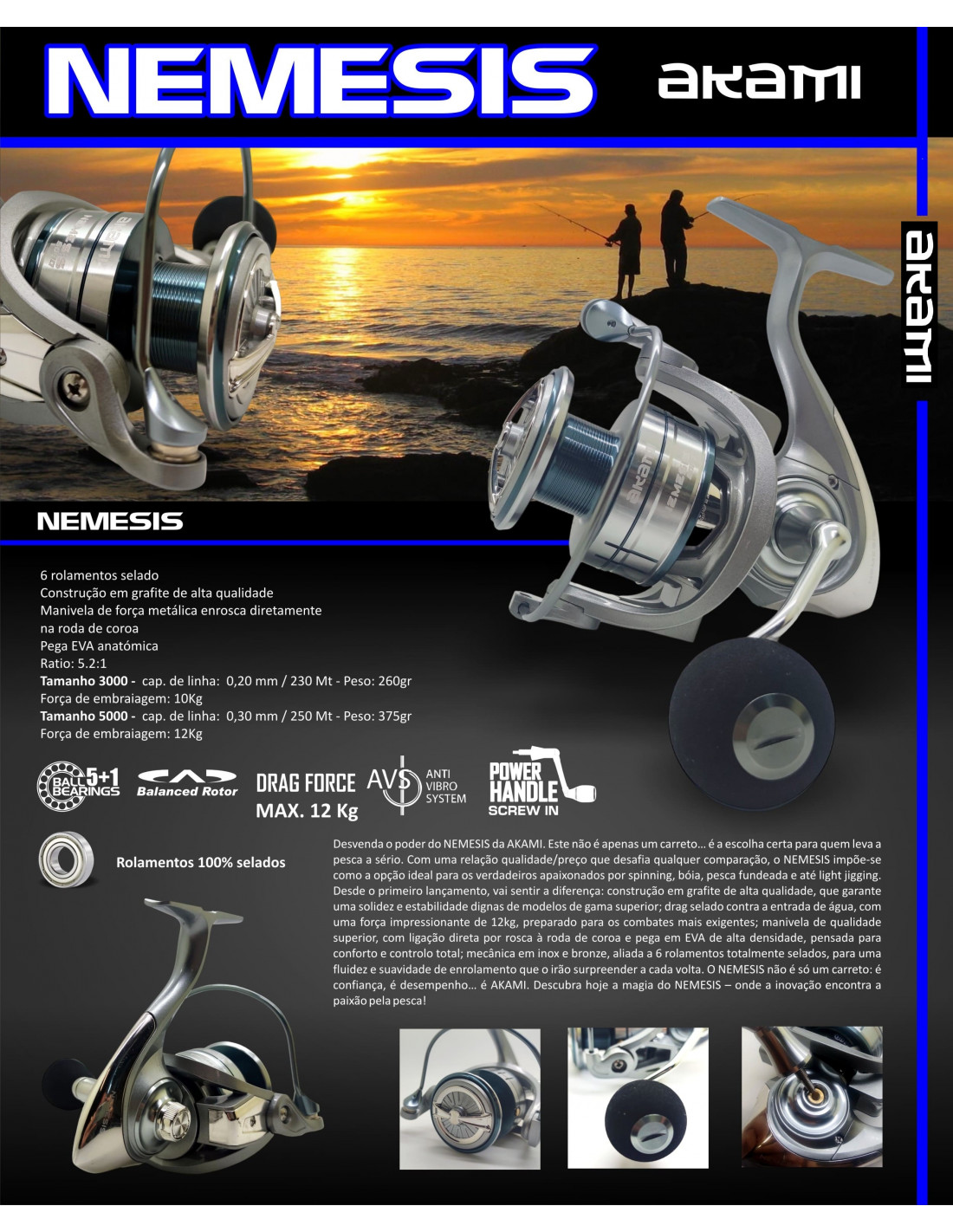 Unleash the power of the AKAMI NEMESIS. This isn't just a reel… it's the right choice for those who take fishing seriously. With a quality/price ratio that defies comparison, the NEMESIS stands out as the ideal option for true enthusiasts of spinning, float fishing, bottom fishing, and even light jigging. From the very first cast, you'll feel the difference: high-quality graphite construction, guaranteeing solidity and stability worthy of top-of-the-line models; sealed drag against water ingress, with an impressive 12kg force, prepared for the most demanding fights; superior quality handle with direct connection to the crown wheel and high-density EVA handle, designed for comfort and total control; stainless steel and bronze mechanics, combined with 6 fully sealed bearings, for smooth and fluid winding that will surprise you with every turn. NEMESIS isn't just a reel: it's confidence, it's performance… it's AKAMI. Discover the magic of NEMESIS today – where innovation meets the passion for fishing!
