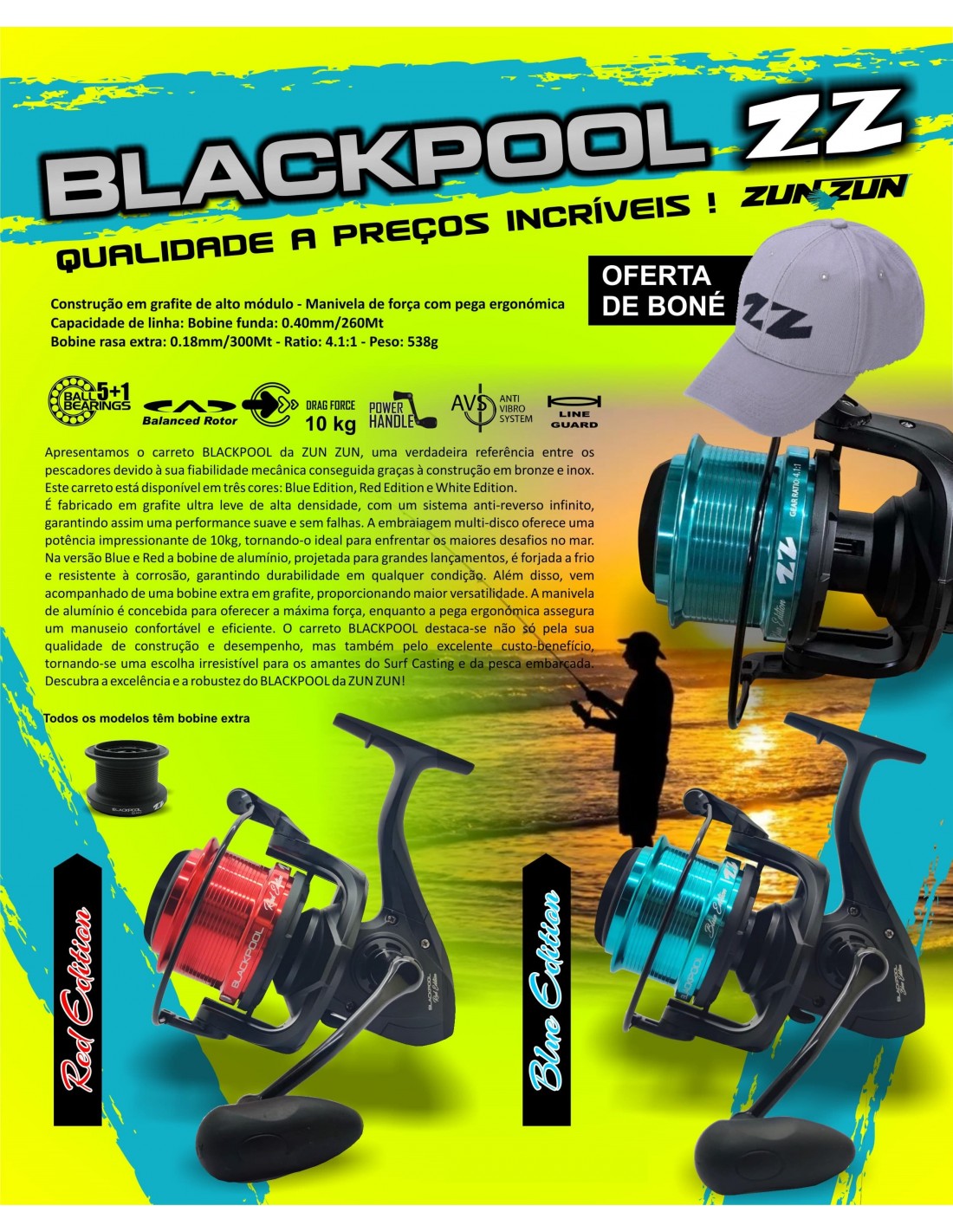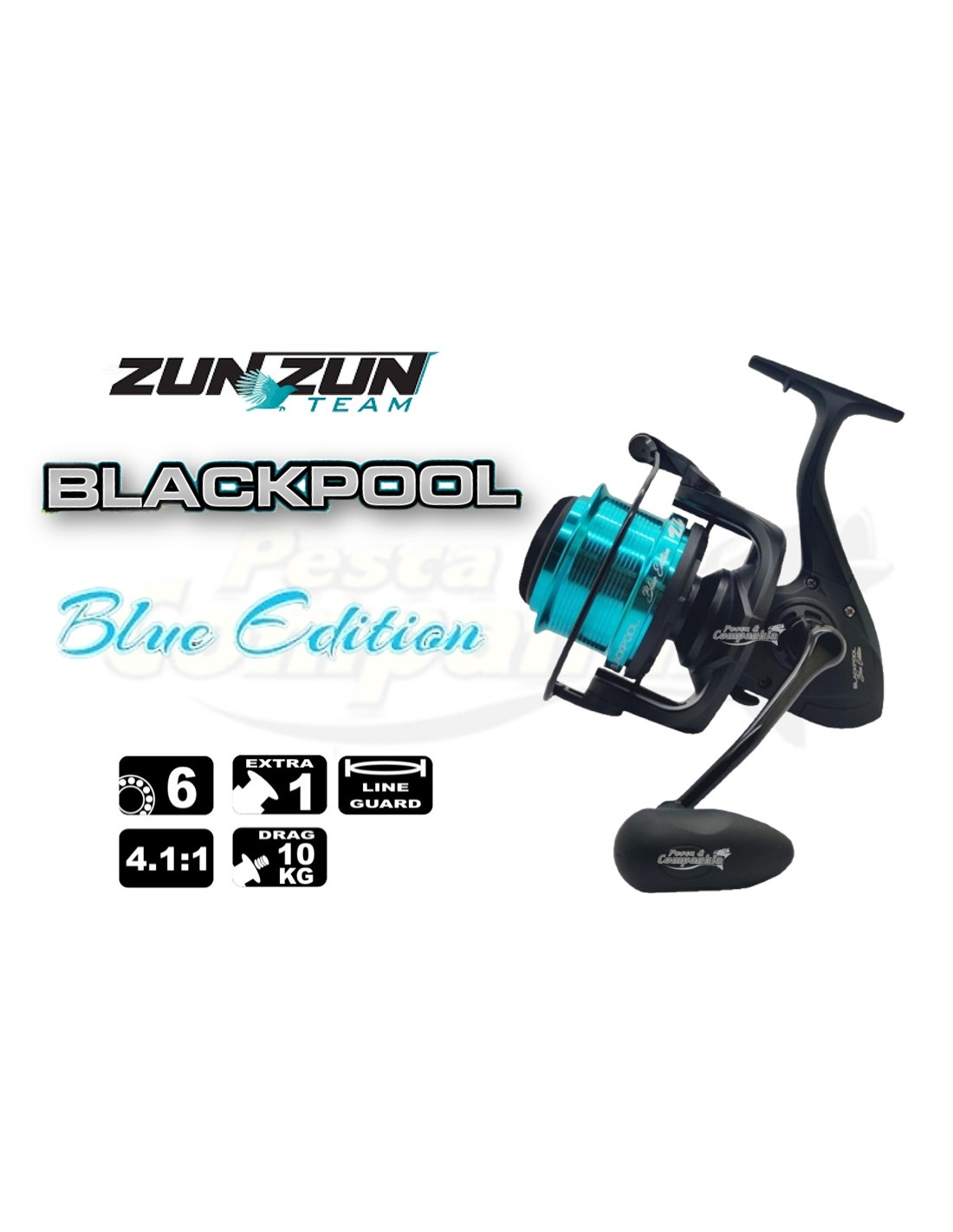 Description We present the BLACKPOOL reel from ZUN ZUN, a true reference among fishermen due to its mechanical reliability achieved thanks to its bronze and stainless steel construction. This reel is available in two colors: Blue Edition and Red Edition. It is made of ultra-light, high-density graphite, with an infinite anti-reverse system, thus guaranteeing smooth and flawless performance. The multi-disc clutch offers an impressive 10kg of power, making it ideal for facing the greatest challenges at sea. In the Blue and Red versions, the aluminum spool, designed for large casts, is cold forged and corrosion resistant, guaranteeing durability in any conditions. In addition, it comes with an extra graphite spool, providing greater versatility. The aluminum crank is designed to offer maximum strength, while the ergonomic handle ensures comfortable and efficient handling. The BLACKPOOL reel stands out not only for its build quality and performance, but also for its excellent value for money, making it an irresistible choice for surf casting and boat fishing enthusiasts. Discover the excellence and robustness of the ZUN ZUN BLACKPOOL!