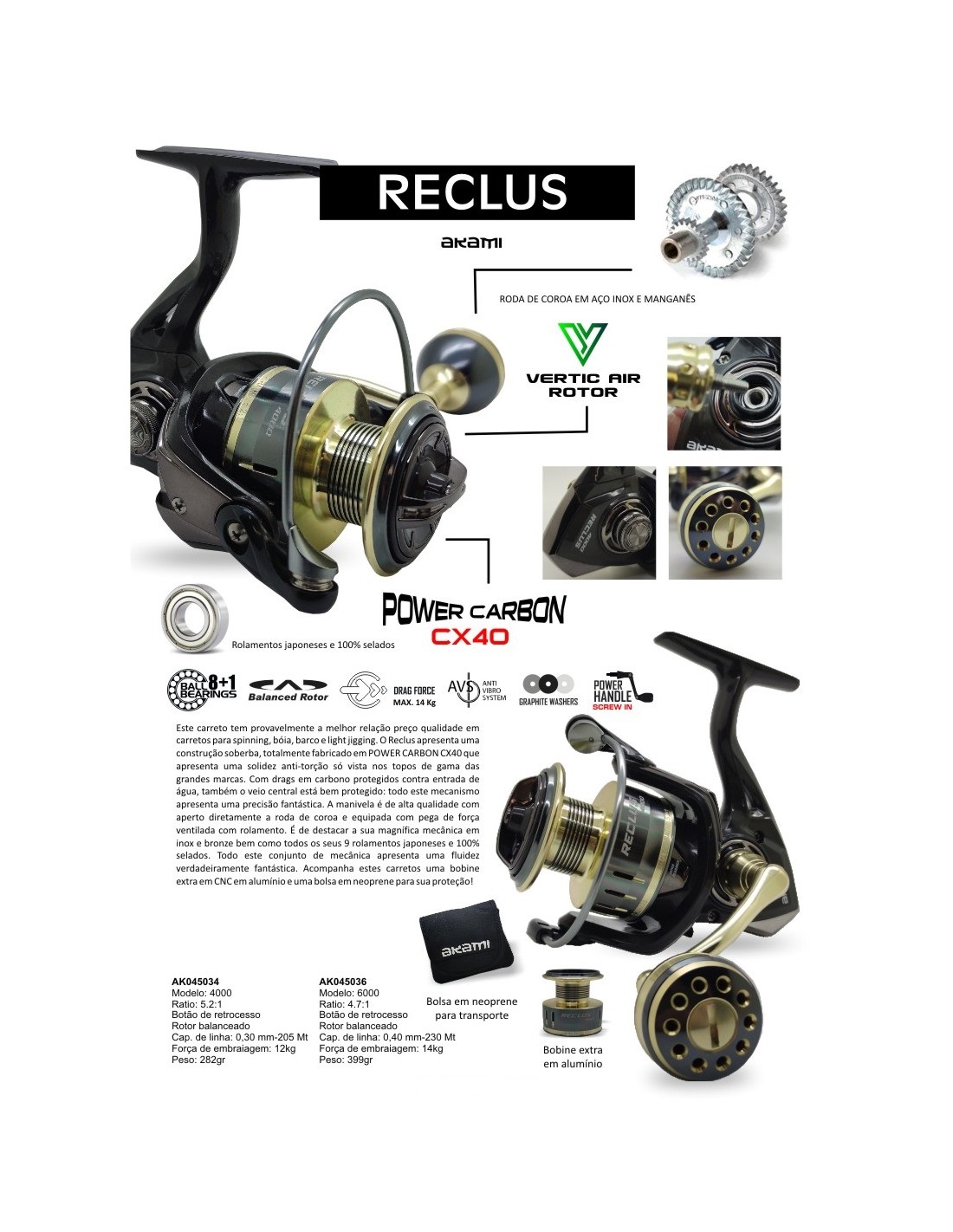 Este carreto tem provavelmente a melhor relação preço qualidade em carretos para spinning, bóia, barco e light jigging. O Reclus apresenta uma construção soberba, totalmente fabricado em POWER CARBON CX40 que apresenta uma solidez anti-torção só vista nos topos de gama das grandes marcas. Com drags em carbono protegidos contra entrada de água, também o veio central está bem protegido: todo este mecanismo apresenta uma precisão fantástica. A manivela é de alta qualidade com aperto diretamente a roda de coroa e equipada com pega de força ventilada com rolamento. É de destacar a sua magnífica mecânica em inox e bronze bem como todos os seus 9 rolamentos japoneses e 100% selados. Todo este conjunto de mecânica apresenta uma fluidez verdadeiramente fantástica. Acompanha estes carretos uma bobine extra em CNC em alumínio e uma bolsa em neoprene para sua proteção! |