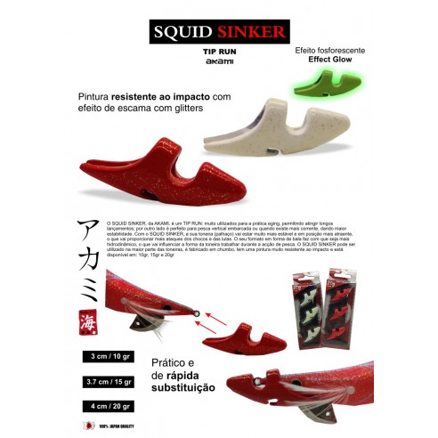 | Descrição O SQUID SINKER, da AKAMI, é um TIP RUN: muito utilizados para a prática eging, permitindo atingir longos lançamentos; por outro lado é perfeito para pesca vertical embarcada ou quando existe mais corrente, dando maior estabilidade. Com o SQUID SINKER, a sua toneira (palhaço) vai estar muito mais estável e em posição mais atraente, o que vai proporcionar mais ataques dos chocos e das lulas. O seu formato em forma de bala faz com que seja mais hidrodinâmico, o que vai influenciar a forma da toneira trabalhar durante a acção de pesca. O SQUID SINKER pode ser utilizado na maior parte das toneiras, é fabricado em chumbo, tem uma pintura muito resistente ao impacto e está disponível em: 10gr, 15gr e 20gr |