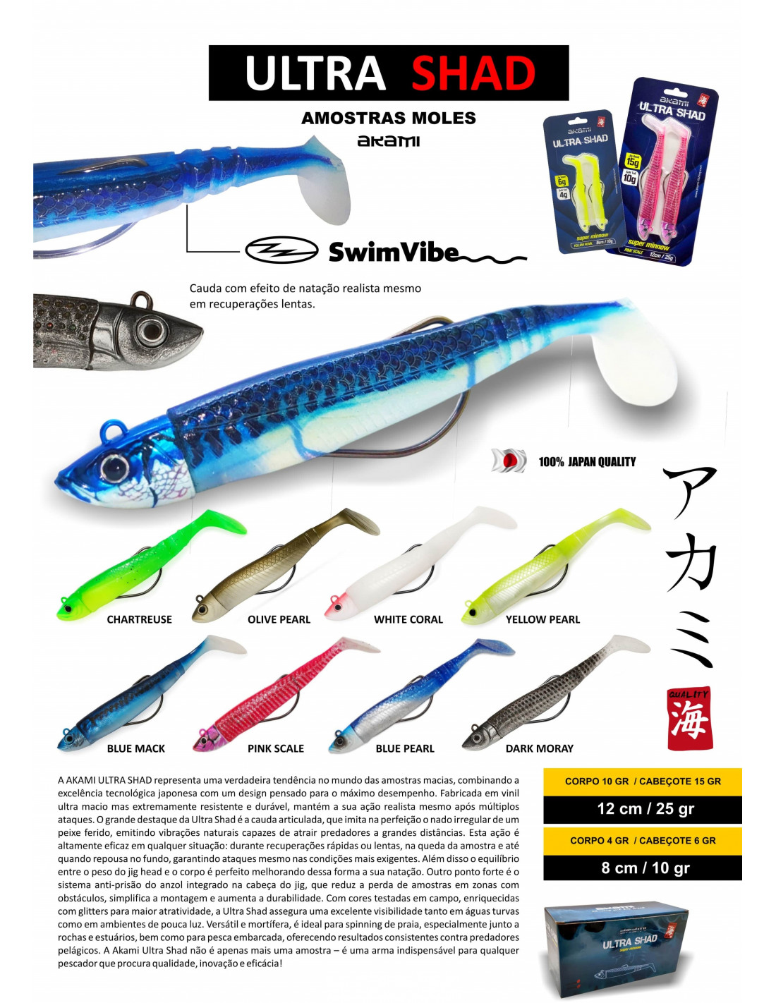 | The AKAMI ULTRA SHAD represents a true trend in the world of soft lures, combining Japanese technological excellence with a design conceived for maximum performance. Made of ultra-soft, yet extremely resistant and durable vinyl, it maintains its realistic action even after multiple strikes. The Ultra Shad's standout feature is its articulated tail, which perfectly mimics the erratic swimming of an injured fish, emitting natural vibrations capable of attracting predators from great distances. This action is highly effective in any situation: during fast or slow retrieves, when the lure falls, and even when resting on the bottom, guaranteeing strikes even in the most demanding conditions. Furthermore, the balance between the weight of the jig head and the body is perfect, thus improving its swimming action. Another strong point is the anti-snag system integrated into the jig head, which reduces lure loss in areas with obstacles, simplifies rigging, and increases durability. With field-tested colors enriched with glitter for greater attractiveness, the Ultra Shad ensures excellent visibility in both murky waters and low-light environments. Versatile and deadly, it's ideal for beach spinning, especially near rocks and estuaries, as well as boat fishing, offering consistent results against pelagic predators. The Akami Ultra Shad is not just another lure – it's an indispensable weapon for any angler seeking quality, innovation, and effectiveness! |