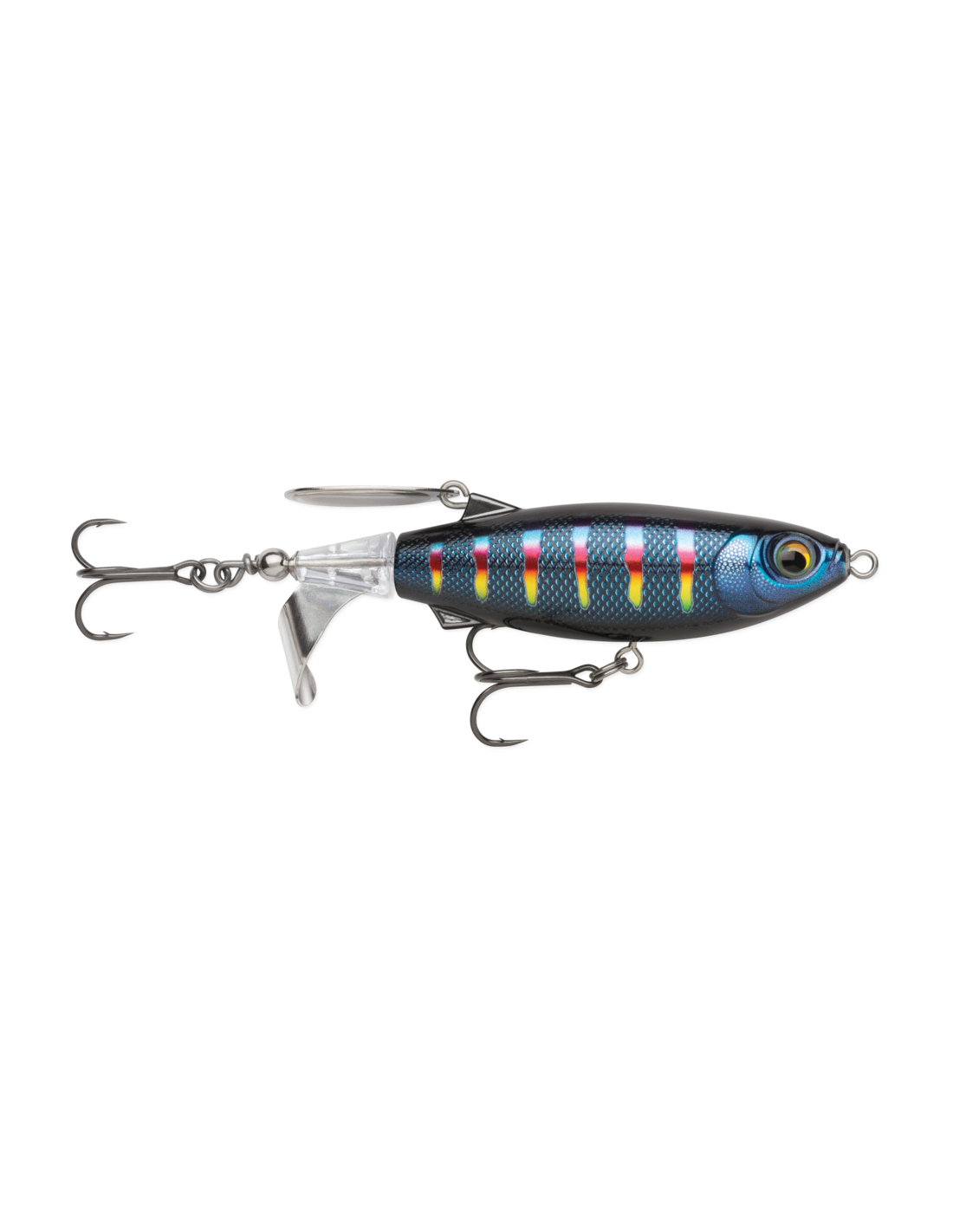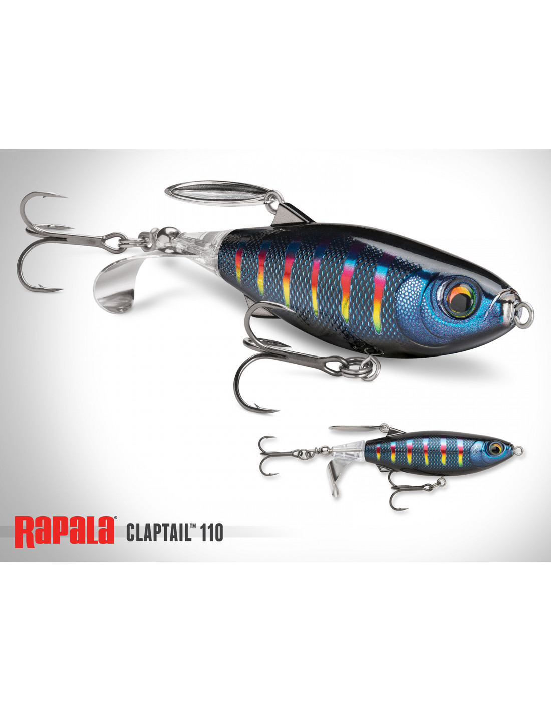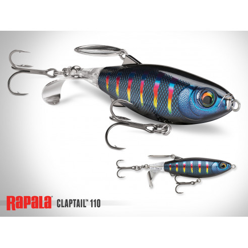 The ClapTail™ 110 is a topwater bait with a metal prop and back blade that collide when retrieved, producing a unique two-tone fish attracting sound. The durable body and balanced weight ensure long casts and a steady retrieve, while the built-in belly swivel reduces leverage to keep fish pinned. California Warning