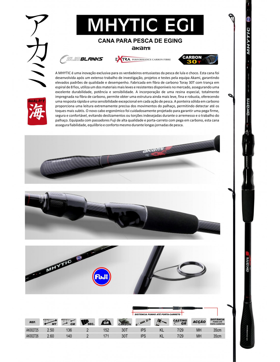 Descrição A MHYTIC é uma inovação exclusiva para os verdadeiros entusiastas da pesca de lula e choco. Esta cana foi desenvolvida após um extenso trabalho de investigação, projetos e testes pela equipa Akami, garantindo elevados padrões de qualidade e desempenho. Fabricada em fibra de carbono Toray 30T com trança em espiral de 8 fios, utiliza um dos materiais mais leves e resistentes disponíveis no mercado, assegurando uma excelente durabilidade, potência e sensibilidade. A incorporação de uma resina especial, totalmente impregnada na fibra de carbono, permite obter uma estrutura ainda mais leve, fina e robusta, oferecendo uma resposta rápida e uma sensibilidade excepcional em cada ação de pesca. A ponteira sólida em carbono proporciona uma leitura extremamente precisa dos movimentos do palhaço, permitindo detectar até os toques mais subtis. O novo cabo ergonómico foi cuidadosamente projetado para garantir uma pega firme, segura e confortável, evitando deslizamentos ou torções indesejadas durante o arremesso e o trabalho do palhaço. Equipada com passadores Fuji de alta qualidade e porta-carreto com pega em carbono, esta cana assegura fiabilidade, equilíbrio e conforto mesmo durante longas jornadas de pesca.