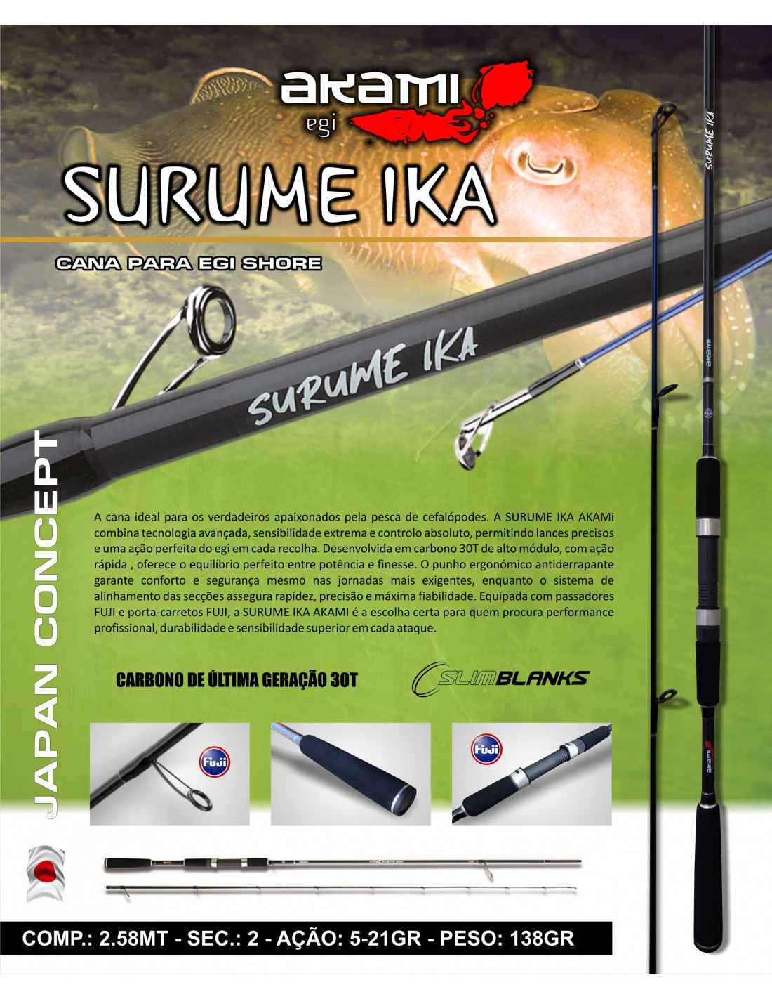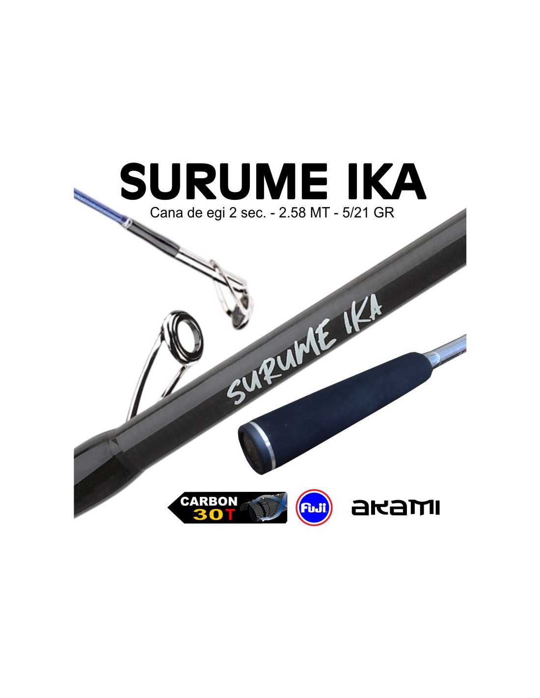 A cana ideal para os verdadeiros apaixonados pela pesca de cefalópodes. A SURUME IKA AKAMi combina tecnologia avançada, sensibilidade extrema e controlo absoluto, permitindo lances precisos e uma ação perfeita do egi em cada recolha. Desenvolvida em carbono 30T de alto módulo, com ação rápida , oferece o equilíbrio perfeito entre potência e finesse. O punho ergonómico antiderrapante garante conforto e segurança mesmo nas jornadas mais exigentes, enquanto o sistema de alinhamento das secções assegura rapidez, precisão e máxima fiabilidade. Equipada com passadores FUJI e porta-carretos FUJI, a SURUME IKA AKAMI é a escolha certa para quem procura performance profissional, durabilidade e sensibilidade superior em cada ataque.