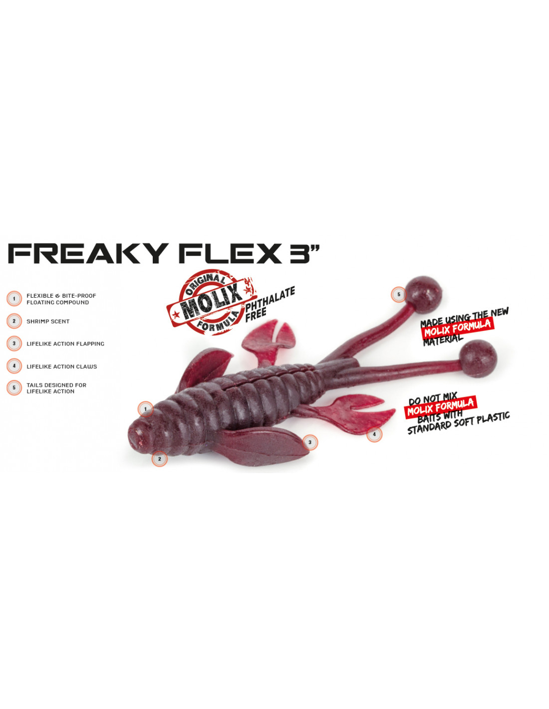 A Freaky Flex é uma pequena criatura que combina na perfeição detalhes e funcionalidades. É feita a partir de uma nova MOLIX FORMULA desenvolvida pela Molix, um composto flutuante extremamente macio e flexível, mais resistente ao corte e enriquecido com sal e aroma de camarão. Os apêndices especiais criam microvibrações durante a natação que, combinadas com as características de flutuação do material, garantem que o isco se mantém de pé enquanto salta do fundo. A Freaky Flex permite diferentes tipos de montagens, sendo adequada tanto para a pesca finesse como para grandes predadores. 6 unidades |