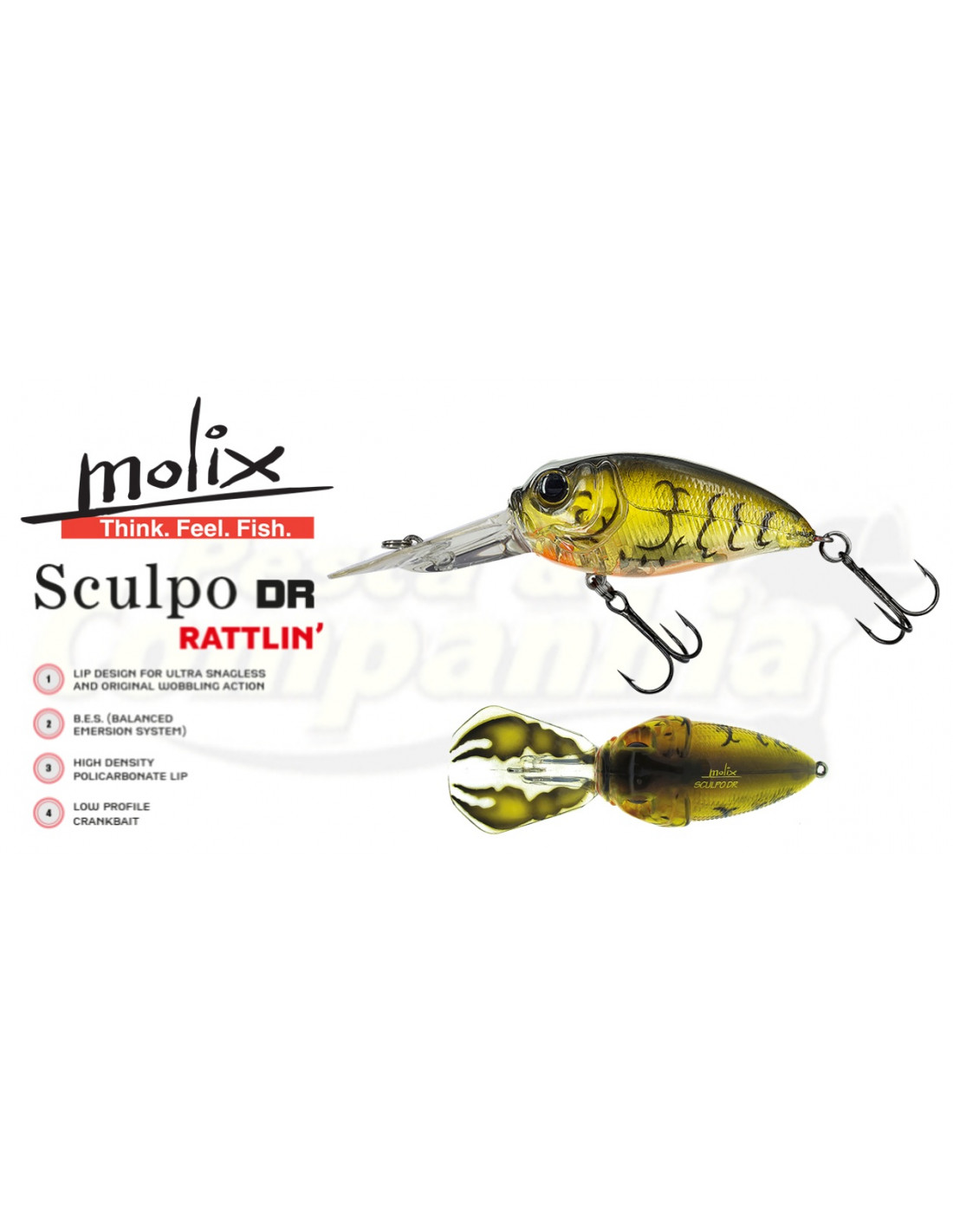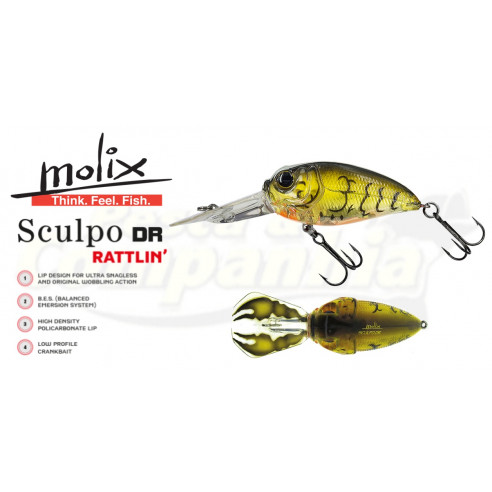 Descrição do Produto O SCULPO DR RATTLIN’ USA SPECIAL EDITION é um crankbait de alta tecnologia que incorpora todas as características mais importantes que o pescador procura num isco desta categoria. Possui uma ação única, inovação e atenção ao detalhe. O SCULPO DR RATTLIN’ USA SPECIAL EDITION tem um perfil baixo, e uma das suas características é uma oscilação única e muito marcante, obtida através de extensos testes e estudos minuciosos da distribuição dos pesos no seu interior (B.E.S.). Estas características conferem ao Sculpo um nado único e um excelente desempenho anti-encalhe entre as pedras. FLUTUANTE RATTLIN’ Comprimento: 5,5 cm (2 1/4 pol.) Peso: 14 g (1/2 oz) Profundidade: 200 a 250 cm (6 a 8 pés) |