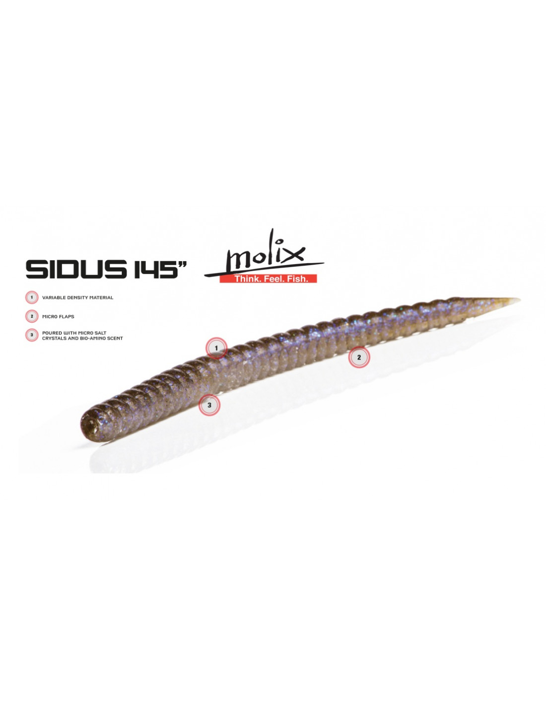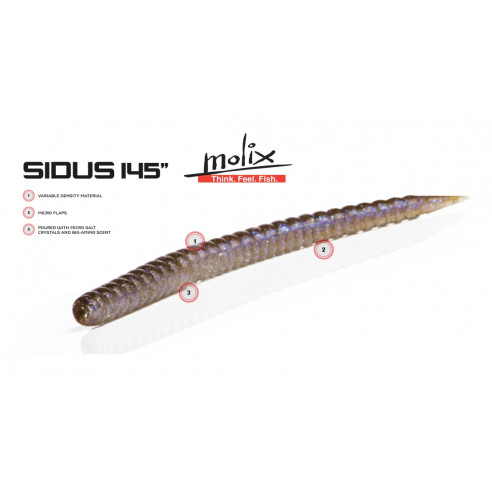 Isca tipo stickbait exclusiva, renovada e produzida com uma nova mistura exclusiva de "plástico de densidade variável" formulada para proporcionar maior consistência, arremessos mais longos e melhor penetração em estruturas submersas densas. Além disso, possui um bom equilíbrio e movimentos mais naturais na água. Essas características fazem da Sidus 120 uma excelente isca para arremessos curtos e precisos, bem como para arremessos longos. A Sidus 145 é perfeita para apresentações finesse, onde o movimento natural é essencial, e para arremessos curtos, onde uma cabeça mais compacta é importante para penetrar na vegetação. As "abas" ao longo do corpo de ambas as versões capturam o ar durante o arremesso e o liberam em ação para atrair mais peixes. Elas também conferem um movimento realista à isca e criam vibrações semelhantes às de um peixe forrageiro real. São preenchidas com microcristais de sal e enriquecidas com Bio-Amino Scent, uma fórmula exclusiva à base de extratos naturais. É mais uma ótima isca soft da Molix para robalos e outros predadores de água salgada.