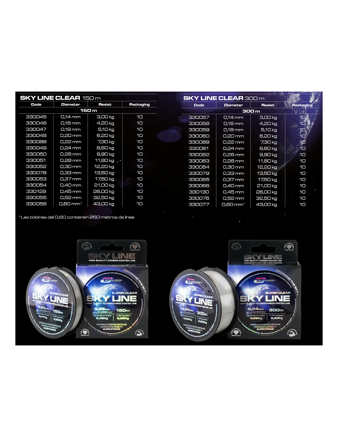 Fantástico multipolímero com grande resistência mecânica. A sua superfície lisa é protegida por uma película de revestimento de carbono que aumenta a sua resistência à abrasão e DURABILIDADE, características fundamentais quando se enfrenta uma competição com bastantes garantias de sucesso. O acabamento SUPER CLEAR confere à linha uma funcionalidade extra graças ao seu revestimento de fluorocarbono, que é menos perceptível na água. |