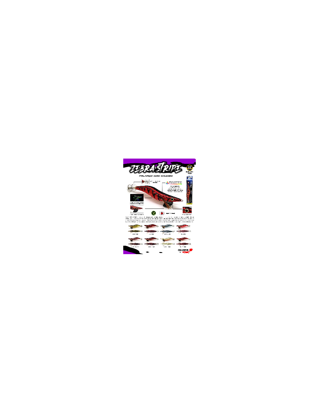 Descrição O Akami Zebra Stripe é um palhaço com chumbo de alto desempenho, desenvolvido especificamente para a pesca de lulas e chocos, com base no comportamento natural dos cefalópodes e na sua forte resposta à atração visual. O seu design hidrodinâmico garante uma natação estável, fluida e natural, permitindo que o isco permaneça mais tempo na zona de ataque, aumentando significativamente a taxa de capturas, mesmo em condições difíceis. O padrão ZEBRA de elevado contraste foi concebido para se destacar em pouca luminosidade, águas turvas e pesca noturna, tornando este palhaço extremamente eficaz em portos, zonas rochosas e fundos mistos. Robusto, bem equilibrado e fiável, o Akami Zebra Stripe é a escolha ideal para pescadores de egi fishing que procuram precisão, controlo e resultados consistentes, tanto em pesca recreativa como mais técnica.