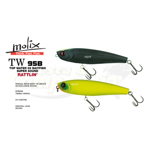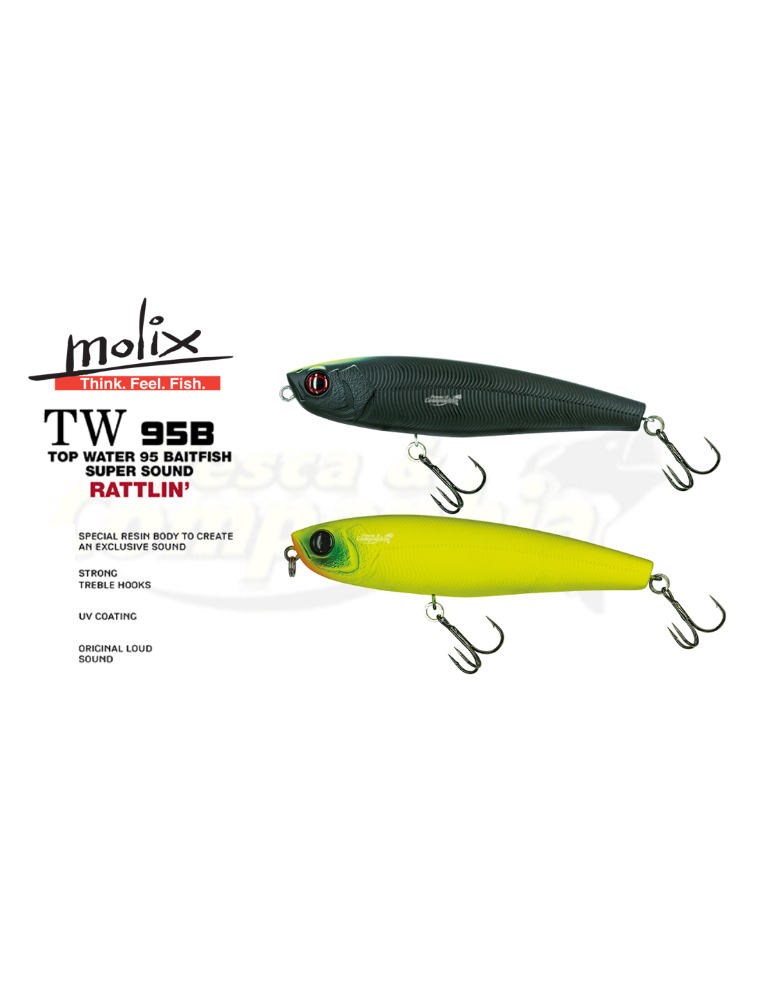 Descrição do Produto A amostra Top Water 95 Baitfish Super Sound é uma amostra do tipo "walking the dog" concebida para estimular até os predadores mais letárgicos. O formato cónico do corpo permite lançamentos longos e precisos, além de facilitar a animação com o recolhimento clássico. As esferas de metal dentro do corpo de resina especial da amostra criam um som único de grande impacto. A TW95B está equipada com dois anzóis triplos resistentes e as cores têm um acabamento com revestimento UV. Peso: 14 g (1/2 oz) Comprimento: 9,5 cm (3 3/4 pol.) |